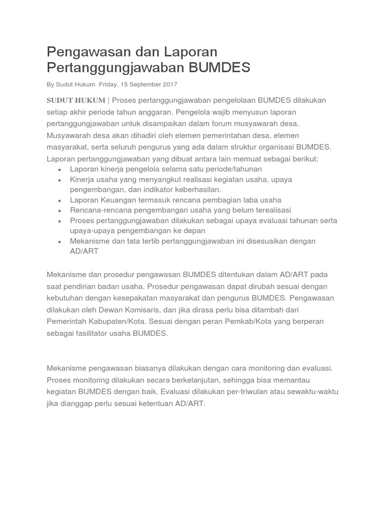 3Laporan pertanggung jawaban pengelolaan badan usaha milik desa bumdes ngudi makmur desa kletek kecamatan pucakwangi kabupatenpati tahun 2018 dasar hukum. 8Laporan Pertanggungjawaban BUMDes 2012.