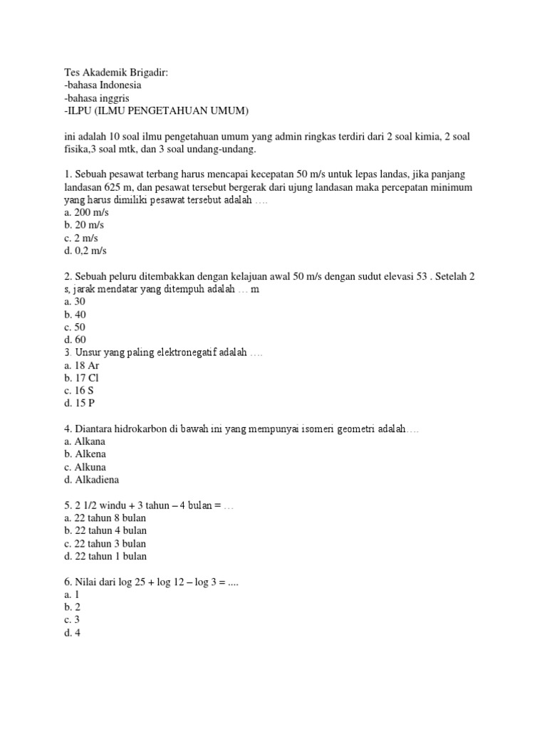 Tes akademik brigadir bahasa indonesia bahasa inggris ilpu ilmu pengetahuan umum ini adalah 10 soal ilmu pengetahuan umum yang admin ringkas terdiri dari 2 soal kimia 2 soal fisika.