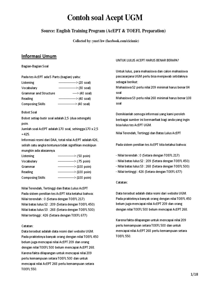 Pdf Contoh Soal Acept Ugm Source English Training Program Acept Toefl Preparation Informasi Umum Muhammad Sulkifly Said Academia Edu