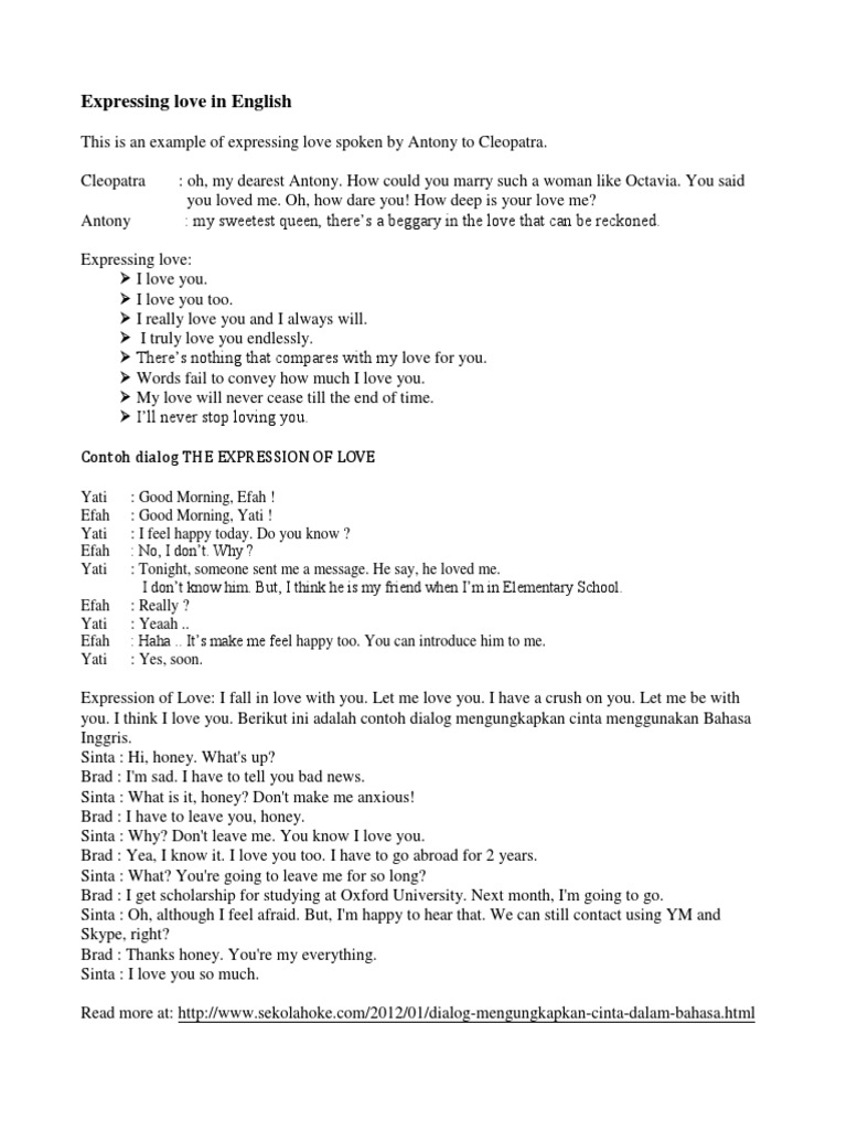 Contoh Soal Expressing Love Dan Jawabannya. Admin dari blog Contoh Soal Terbaru 2020 juga mengumpulkan gambar-gambar lainnya terkait. 265 Contoh Dialog Expressing Love Mengekpresikan rasa cinta bisa dilakukan dengan banyak caraRasa cinta juga bisa diungkapkan pada siapa saja bisa pada orangtua teman sahabat saudara bahkan kekasih.