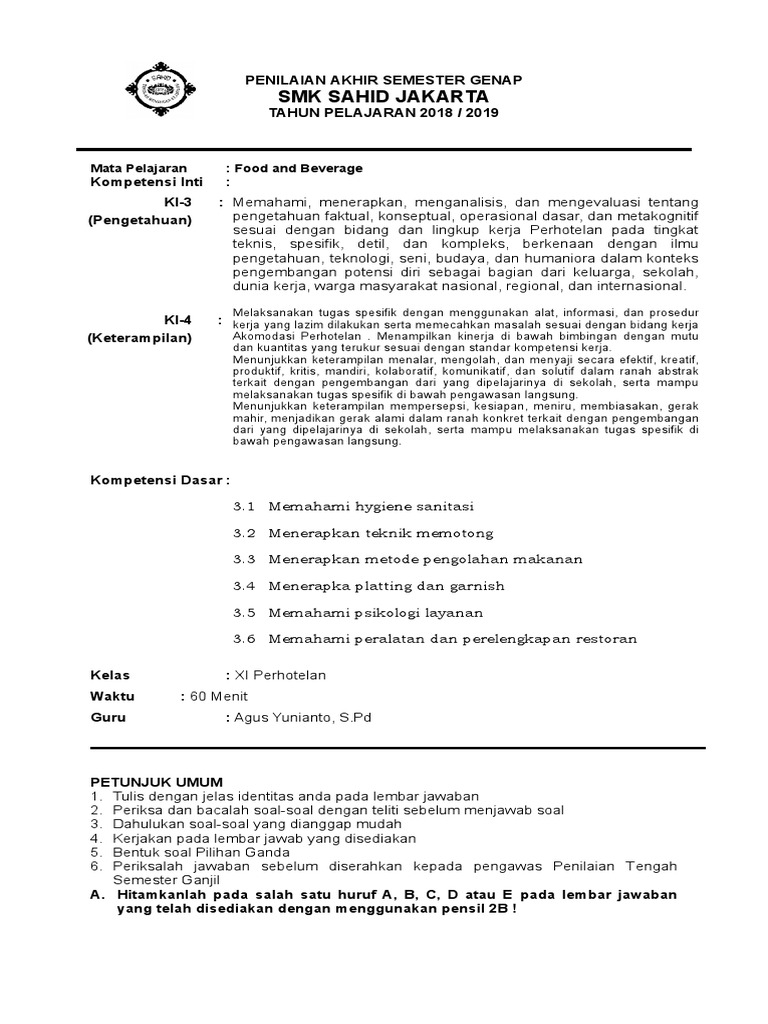 Soal Uas Pilihan Ganda Food And Beverage Produktif Perhotelan Kelas Xi Semester Ganjil Beserta Kunci Jawaban Dunia Smk