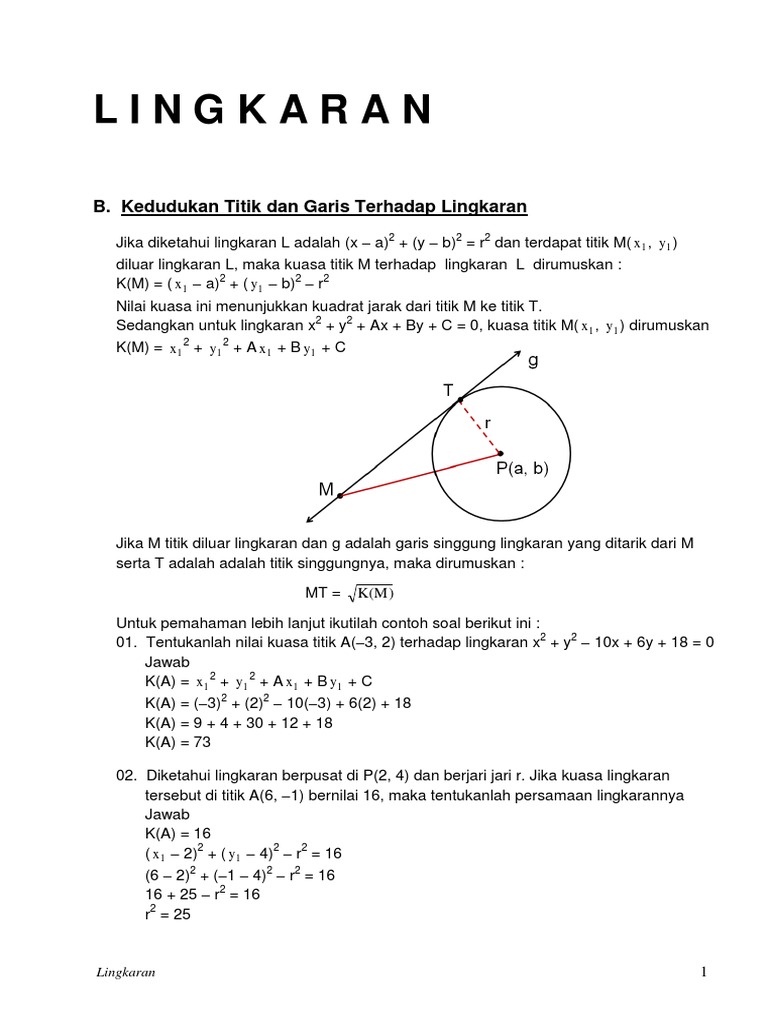 Contoh soal kedudukan titik terhadap lingkaran. 16Contoh soal Tentukan persamaan garis singgung lingkaran. Menjabarkan kedua persamaan lingkaran. Titik yang terletak pada garis kuasa dan memiliki kuasa yang sama pada kedua lingkaran.