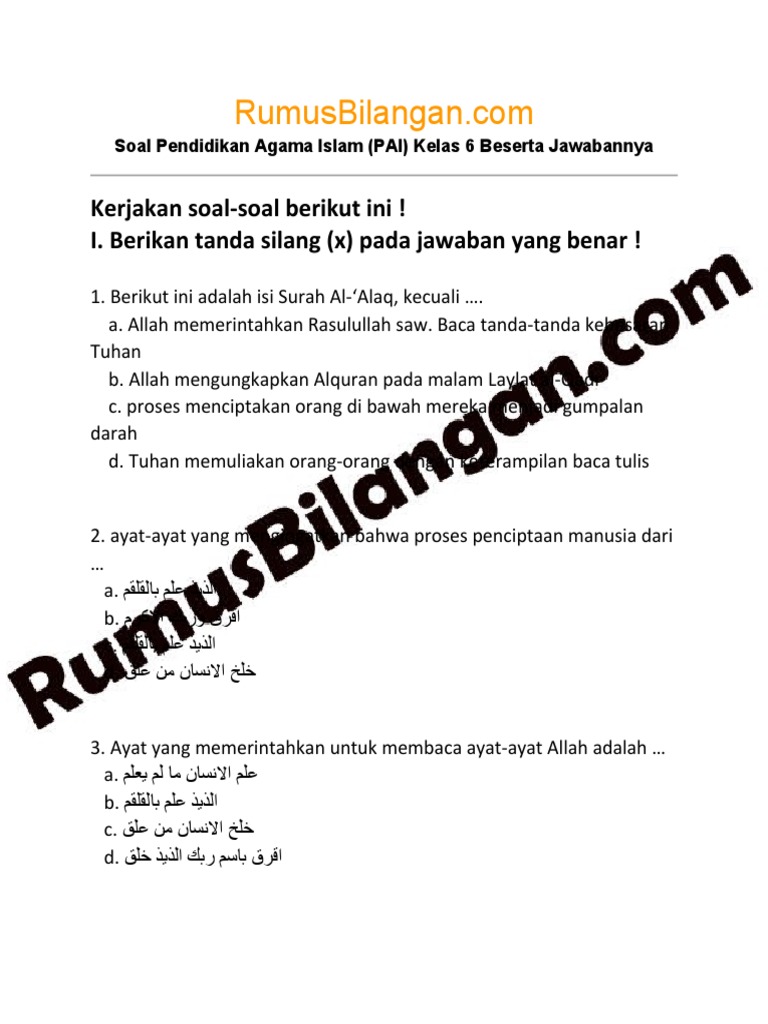 Soal Pendidikan Agama Islam Pai Kelas 6 Beserta Jawabannya