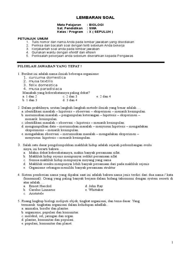 1Kali ini tim Banker Soal akan membagikan Soal dan Pembahasan Biologi Kelas X Bab 1. Semoga soal mapel Biologi SMA MA kelas X bermanfaat bagi pembaca. 4Soal Biologi Kelas 10 Semester 1 Ruang Lingkup Penelitian Biologi 04 Agustus Soal Biologi Comment Kali ini saya akan coba bagikan contoh soal ulangan atau penilaian harian biologi kelas 10 semester ganjil bab hakikat ruang lingkup biologi.