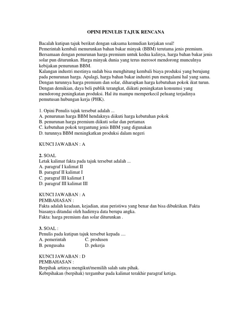 DTajuk rencana merupakan pendirian redaktur terhadap pokok persoalan baik yang menyangkut masalah politiksosialmaupun ekonomi. Doc Contoh Prediksi Soal Un Sma 09 Sugiyo Rasyidin. 3Teks berikut untuk tiga nomor soal di bawah ini Bacalah dengan cermat tajuk rencana berikut.