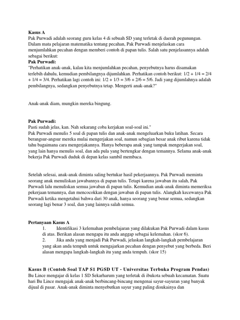 Soal Tap Ut Pgsd Kasus Pak Purwadi Dan Ibu Lince Lengkap Dengan Kunci Jawaban
