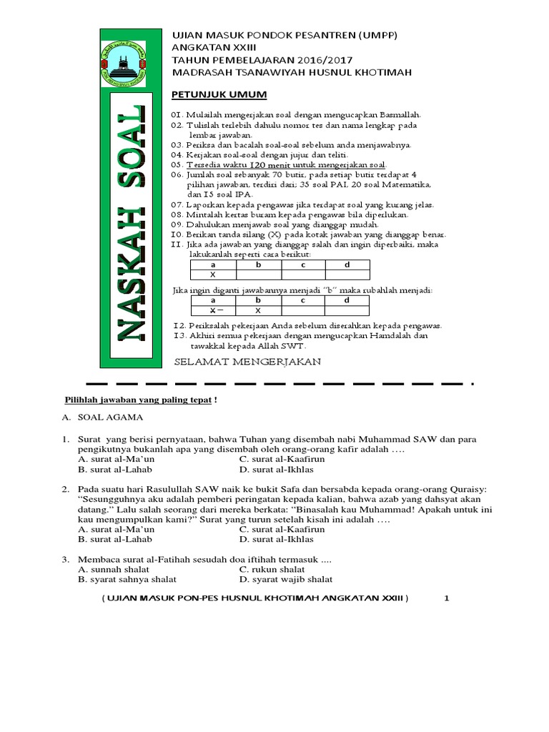 SOAL UJIAN PSB MA 2020-2021. SOAL UJIAN PSB MA 2018-2019. 13Contoh Soal Tes Masuk Pondok Pesantren Barisan Contoh.