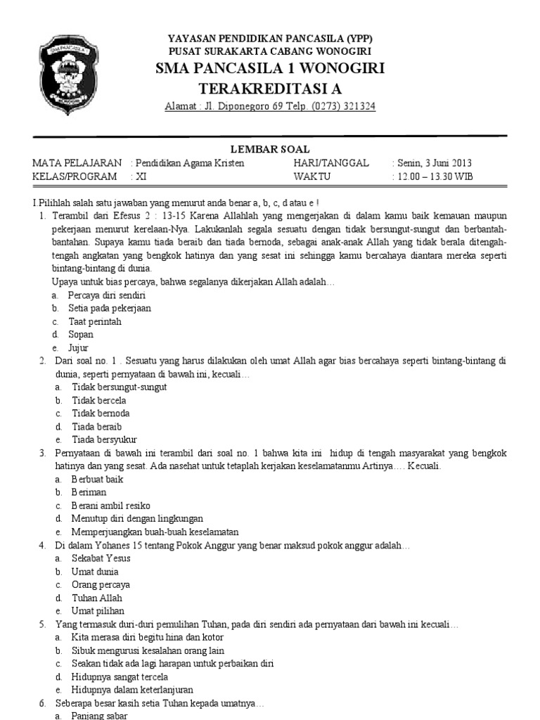 20LATIHAN SOAL AGAMA KRISTEN SMA. Contoh ujian praktek ipa kelas 6 sdPendidikan agama dan budi pekerti bahasa. Soal agama kristen protestan dan kunci jawaban kelas 12 semester 1 dan 2 informasi ini adalah soal agama kristen protestan dan kunci jawaban kelas 12 semester 1 dan 2 yang bisa anda download secara gratis di website pendidikan agama kristen dan budi pekerti kelas 1 sd kurikulum 2013.