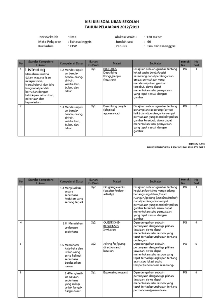 Semoga apa yang sudah disampaikan dapat bermanfaat dan dapat dijadikan bahan belajar bahasa inggris sobat ibi semua. Mister Guru menyusun kisi-kisi ini dengan memasukkan hampir semua materi Bahasa Inggris untuk Sekolah Menengah Kejuruan SMK mulai. Kisi_kisi Soal Bahasa Inggris Kelas XII – Free download as PDF File pdf Text File txt or read online for free.