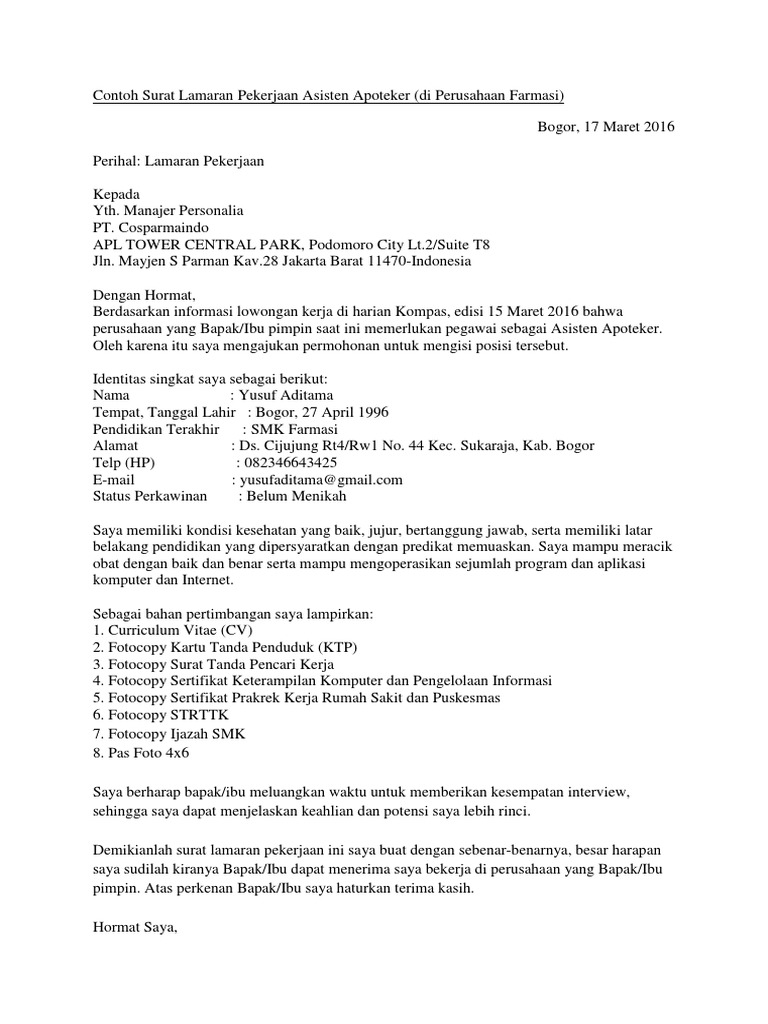Asisten Apoteker Contoh Surat Lamaran Kerja Di Apotek