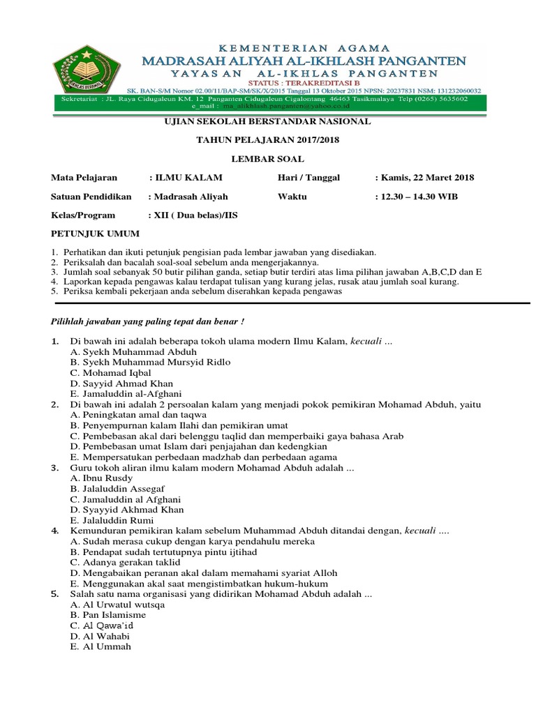 Pdf Soal Uambn Ilmu Kalam Utama 2015 2016 Baety Nur Academia Edu