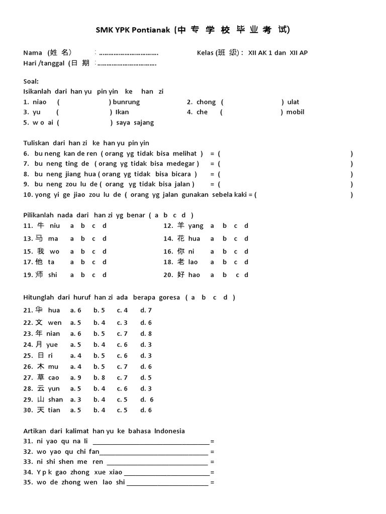 Pastikan sebelum menjawab anda telah membaca petunjuk dan perintahnya. SOAL BAHASA MANDARI KELAS XI SMK SEMESTER GENAP. Biasakan membaca huruf Mandarin.
