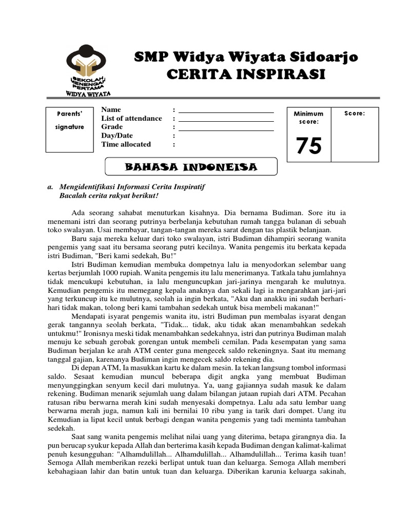 19Materi Teks Cerita Inspiratif bahasa Indonesia ini sangat penting dibekali kepada siswa agar mampu memberi inspirasi kebaikan kepada setiap orang melalui teks cerita inspiratif. 2 Namun nyatanya dugaannya salah besar ternyata anak-anak sekolah tersebut sedang membagi-bagikan baju bekas dan makanan kepada seorang bapak tunawisma yang biasanya sering berkeliaran di kawasan sekolah. SOAL ASPEK YANG DINILAI SKOR 1 awal 0 25 tengah 0 25 akhir 0 25 Koda 0 25 0 100.