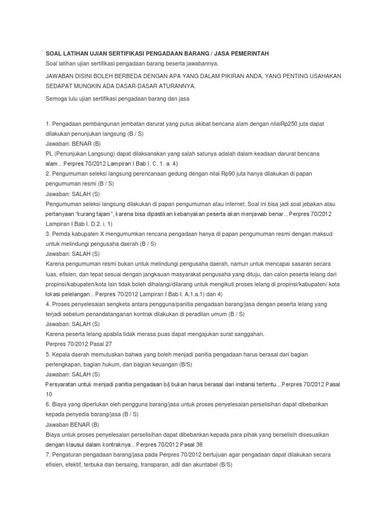 SALAH S Semua itu adalah prinsip dasar dari pengadaan barangjasa namun dalam soal di atas merupakan jebakan karena untuk adil harus ditambah adiltidak diskriminatifPerpres. 14Latihan dan jawaban ujian sertifikasi pengadaan barangjasa 90 soal lengkap. 18Soal dan Jawaban Pengadaan Barang dan Jasa Pemerintah 1.