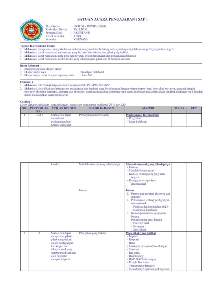 Sap Mata Kuliah Ekspor Impor Diploma Iii Akuntansi 3 Sks