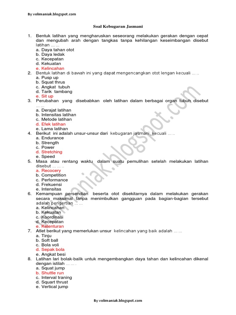40 Soal Tentang Kebugaran Jasmani Beserta Jawabannya Terbaru Ahmad Anton Friday July 26 2019 Contoh soal yang ada ditulisan ini merupakan rangkuman materi Penjas khususnya untuk BAB Kebugaran Jasmani yang sengaja kami buat dalam bentuk pertanyaan-pertanyaan pilihan ganda tanpa essay. 55 soal pilgan dan essay tentang kebugaran jasmani dan jawabannya. 3Soal kebugaran jasmani 1.