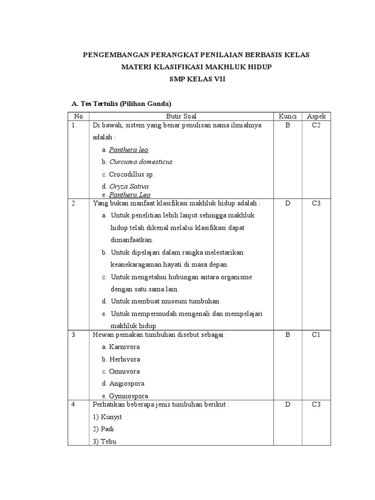 Soal Klasifikasi Makhluk Hidup Materi Ipa Kelas 7 Smp Mts Kurikulum 2013