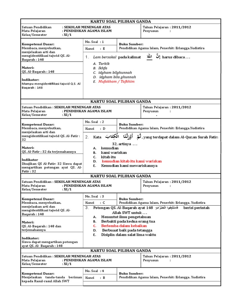 Soal Pilihan Ganda Dan Jawaban Agama Islam Kelas 11 Kumpulan Contoh Surat Dan Soal Terlengkap