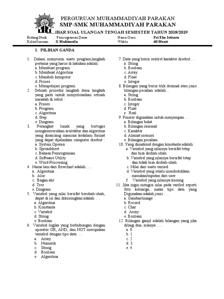 Pilihan Ganda 40 soal Pilihan Ganda Pilihlah. Bank Soal Pemrograman Dasar Kelas XPada bagian kedua di Kelas X Semester 2 ini siswa dik enalkan pada bahasa pemrograman untuk membuat program atau aplikasi. 4 x 45 menit A.