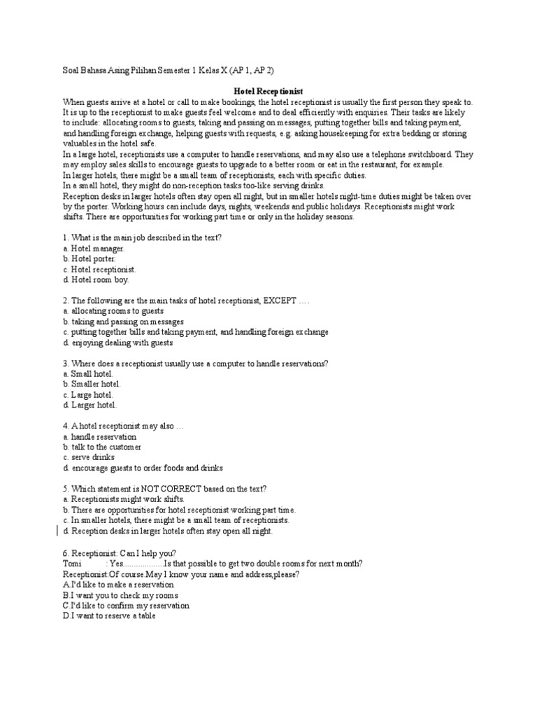 Soal Bahasa Asing Pilihan Semester 1 Kelas X Business Leisure