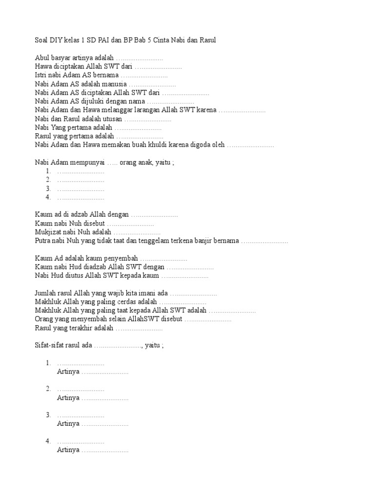 Soal Diy Kelas 1 Sd Pai Dan Bp Bab 5 Cinta Nabi Dan Rasul 01 Pdf