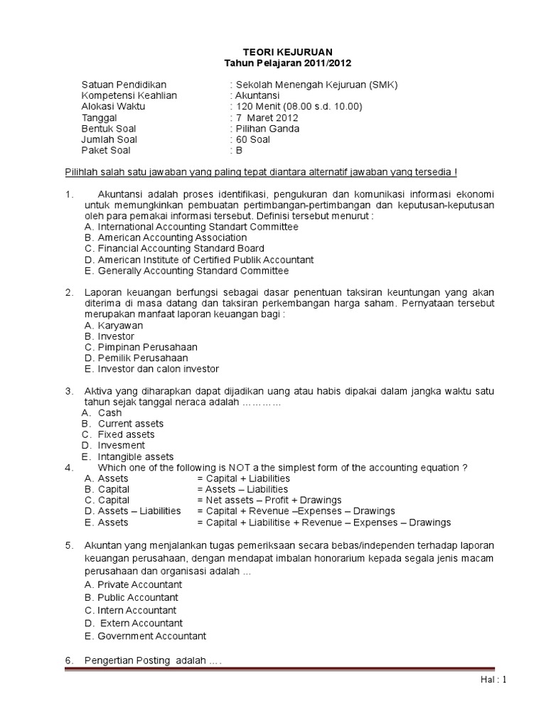 Paket A — Download KLIK DISINI. Baca doa sebelum memulai. 11Download soal un teori kejuruan akuntansi smk 2011.
