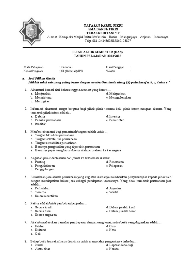 Soal Uas Ekonomi Kelas Xi Semester 1 Kurikulum 2013 Administrasi Sekolah Sd Mi Smp Mts Sma Ma Smk