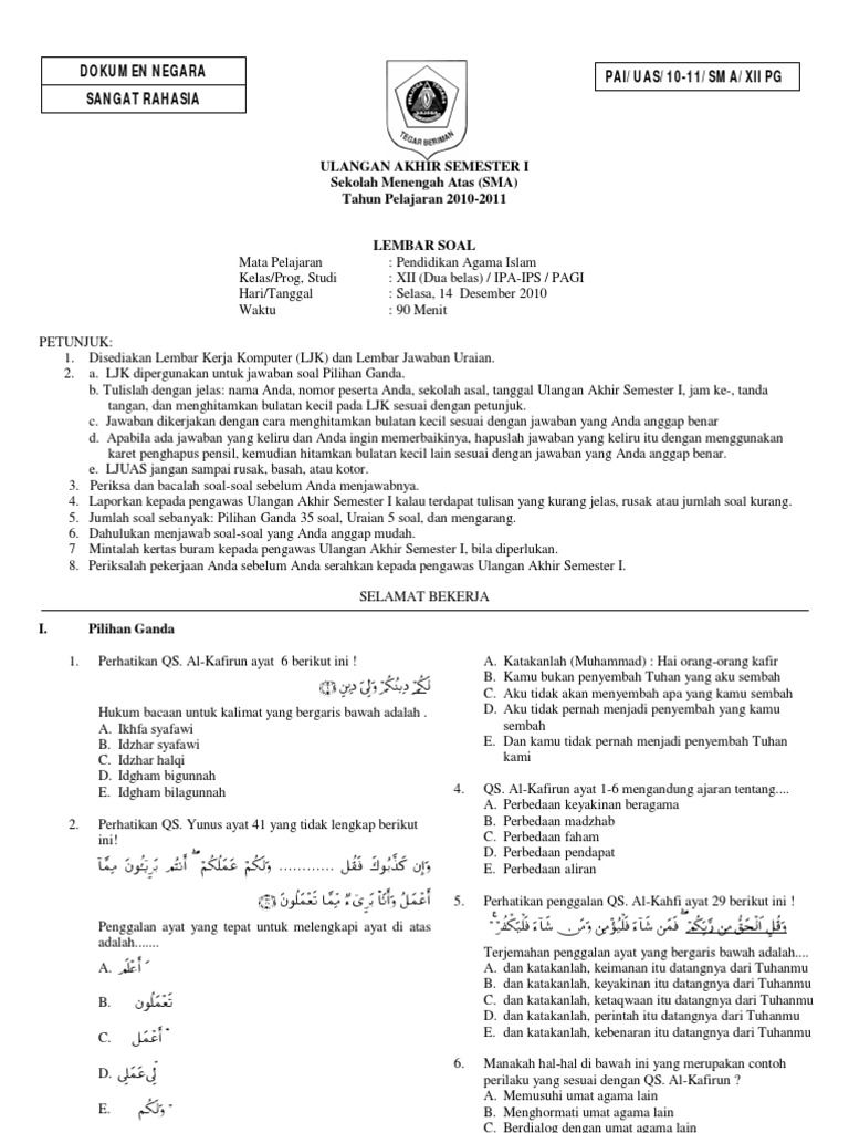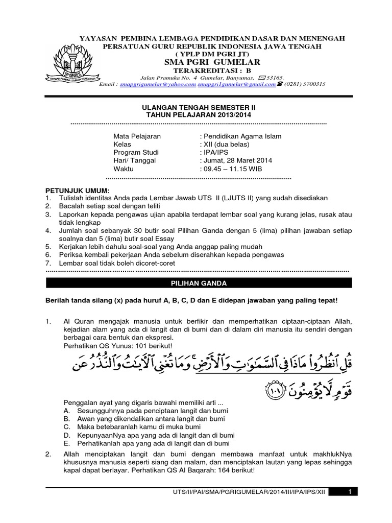 Soal uas pai sma kelas xii semester 2. 13Soal UAS PAS PAI Kelas 8 Semester 1 Lengkap dengan Jawaban – Biasanya setiap tahunnya beberapa soal ada yang sama dengan sebelumnya. Contoh soal pai kelas 10 semester 2 beserta jawabannya pilihan ganda. SMA BUDI UTOMO PERAK ULANGAN TENGAH SEMESTER GENAP TAHUN PELAJARAN 2015.