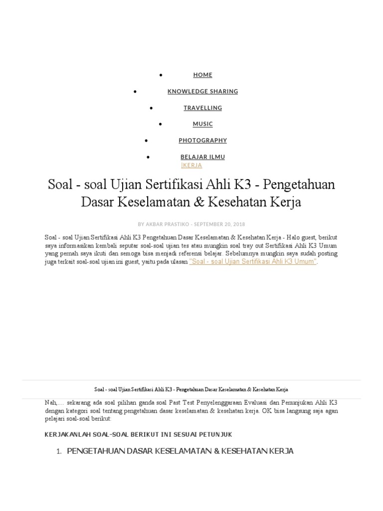 Soal Soal Ujian Sertifikasi Ahli K3 Pengetahuan Dasar Keselamatan Kesehatan Kerja Akbarartikel Akbar