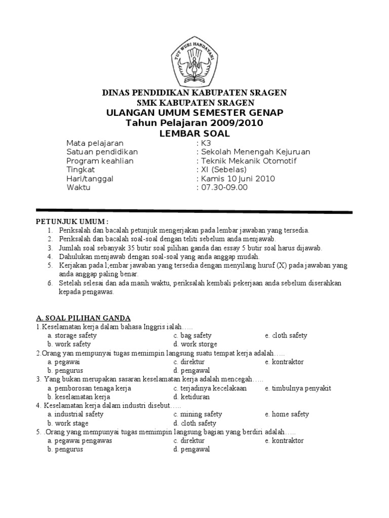 Soal ujian k3 umum. 11download contoh soal test AK3 umumBagi sobat yang lagi mengikuti trainning Ahli Keelamatan dan kesehatan kerja umum atau sering disaebut AK3 umum tentu akan pusing dan berdebar untuk mengikuti tes kelulusan ahli K3 umum karena memang materi nya cukup banyak dan kesempatanuntuk belajar sangatlah singkat. Soal Pts Ski Kelas 8 Semester Genap 20i8 20i9 Docx Perpustakaan Bijak. Contoh soal dan jawaban tes intelegensi umum.