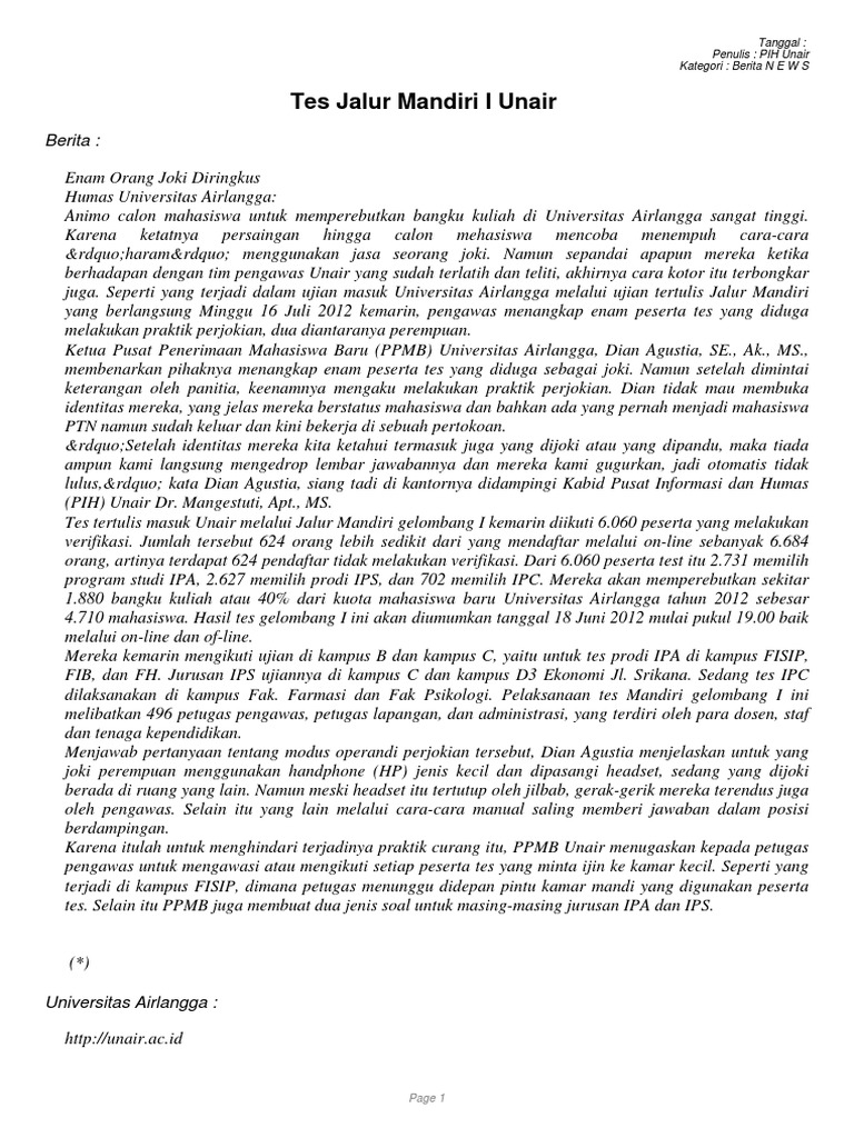 Dengan mempelajari dan menguasai Prediksi soal ini Insya Allah peluang kelulusan Anda dalam Tes Um Unair akan semakin terbuka lebar. Kampus-kampus yang banyak diminati dan sering dibahas adalah soal ujian mandiri Unair UGM Unpad Undip UB UNS ITS serta soal ujian mandiri. Pengumuman Peserta Lulus Seleksi Calon Mahasiswa Baru Program Pendidikan Sarjana Jalur Mandiri Universitas Airlangga Tahun Akademik 20212022 klik disini Info Registrasi klik disini Untuk informasi registrasi ulang anda dapat menghubungi helpdesk regmaba.