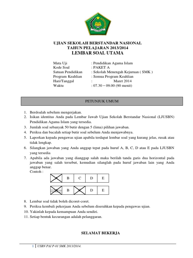 Soal Usbn Pai Smk 2014 Paket A